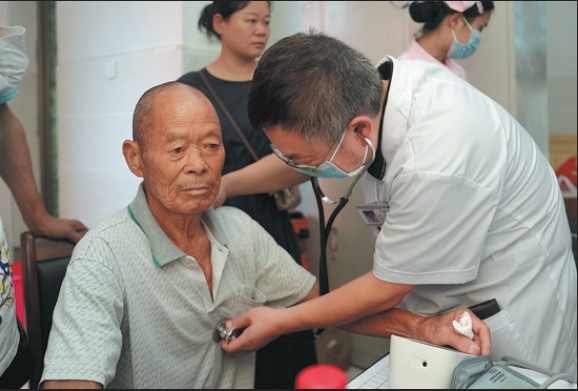 A villager receives a medical checkup at a makeshift shelter in a vocational school in Huarong on Sunday. (XUE YUGE/CHEN ZHENHAI/XINHUA)