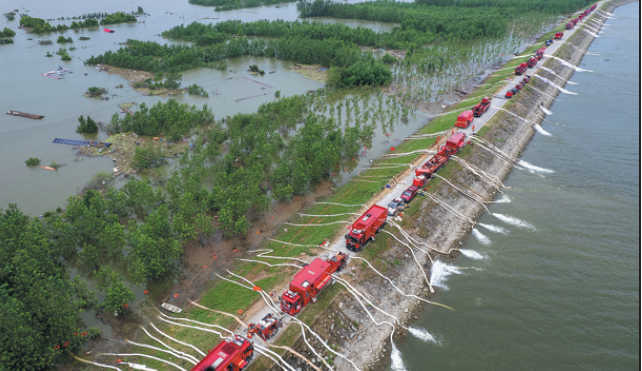 Rescuers drain floodwater from an area near Dongting Lake in Huarong county on Tuesday. (CHEN SIHAN/XINHUA)