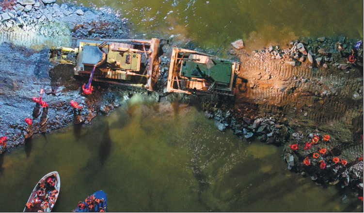 Rescuers work to block the dike breach next to Dongting Lake in Huarong county, Hunan province, on Monday. As of Monday afternoon, 180.5 meters of the 226-m breach in the dike had been sealed, according to the Yueyang flood control and drought relief headquarters. (CHEN ZEGUO/XINHUA)