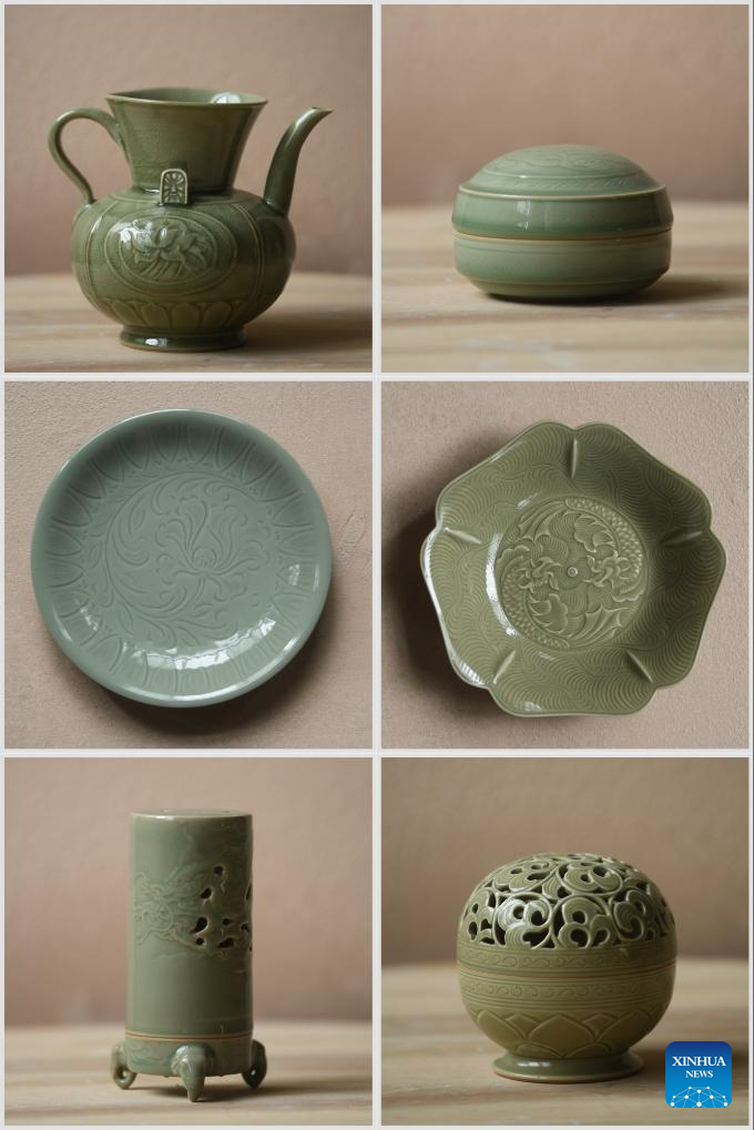 This combo photo taken on July 11, 2024 shows celadon wares made by Xie Zhenwei in Shabu Township, Huangyan of Taizhou, east China's Zhejiang Province. (Xinhua/Weng Xinyang)