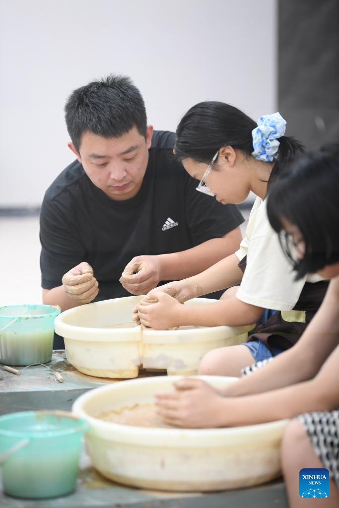 Xie Zhenwei gives instruction in a pottery class for primary school students at his studio in Shabu Township, Huangyan of Taizhou, east China's Zhejiang Province, July 11, 2024. (Xinhua/Weng Xinyang)