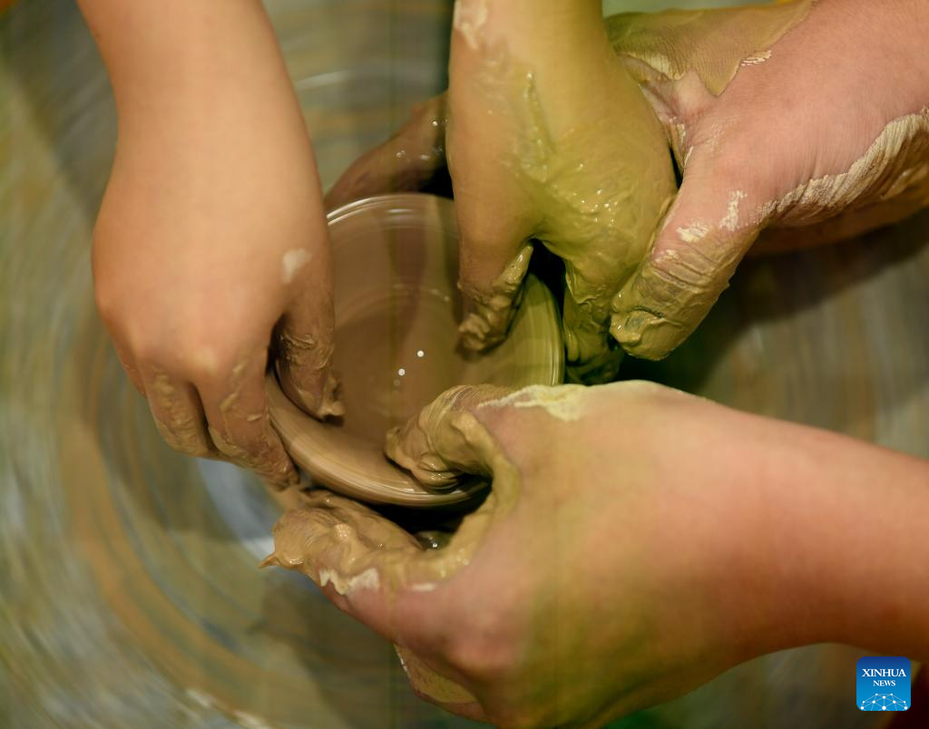 Xie Zhenwei helps a primary school student make a piece of porcelain in Shabu Township, Huangyan of Taizhou, east China's Zhejiang Province, July 11, 2024.? (Xinhua/Weng Xinyang)