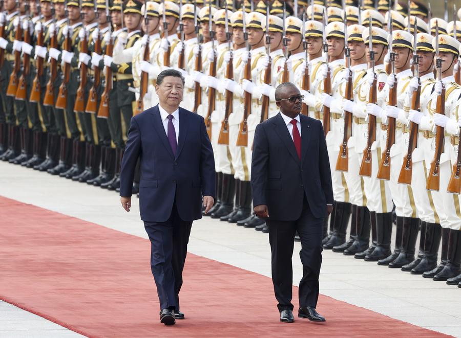 BEIJING, July 11 (Xinhua) -- In the square outside the east entrance of the Great Hall of the People in Beijing, Chinese President Xi Jinping held an official welcome ceremony for President Umaro Sissoco Embalo of the Republic of Guinea-Bissau on Wednesday, featuring a unique touch: the playing of Guinea-Bissau's national anthem, "This Is Our Well Beloved Motherland."
