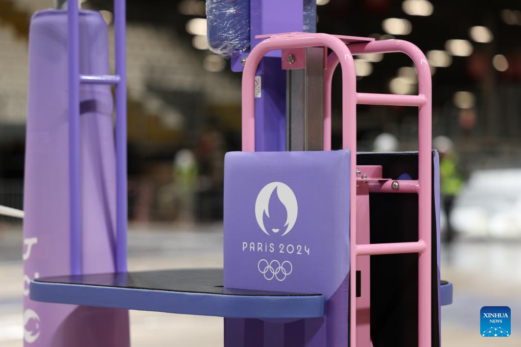 This photo taken on July 11, 2024 shows the sports facilities in the South Paris Arena, in Paris, France. The South Paris Arena will host sports events like weightlifting, handball, table tennis and volleyball during the Paris 2024 Olympic Games. (Photo by Julien Mattia/Xinhua)