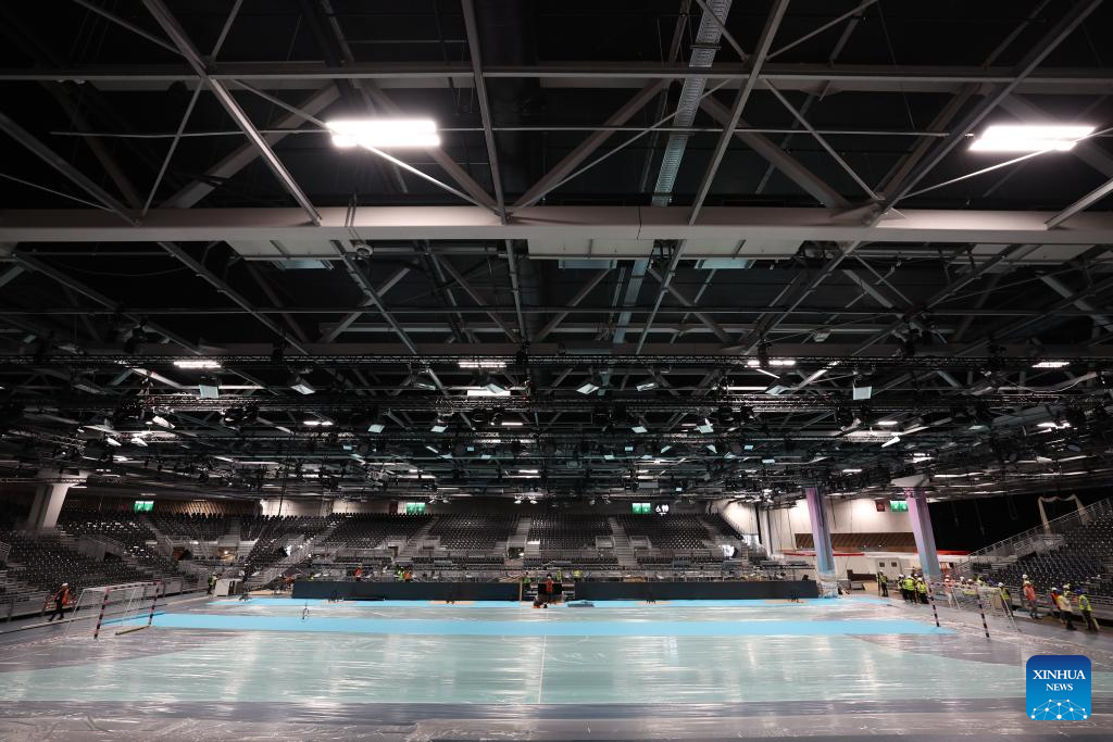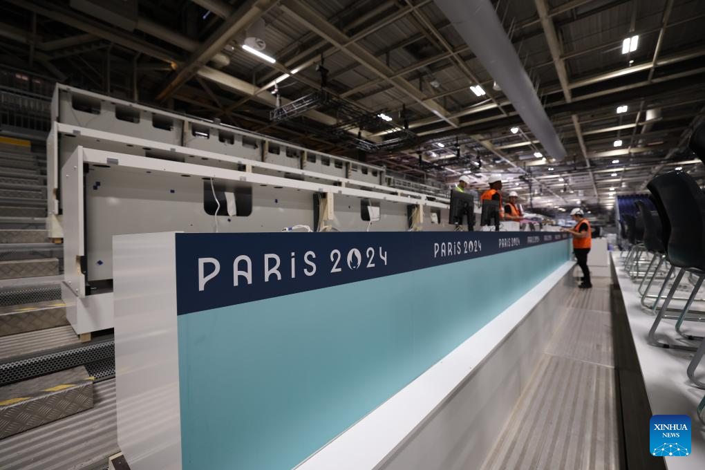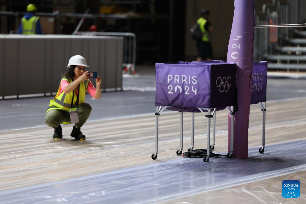 Staffs work in the South Paris Arena in Paris, France, July 11, 2024. The South Paris Arena will host sports events like weightlifting, handball, table tennis and volleyball during the Paris 2024 Olympic Games. (Photo by Julien Mattia/Xinhua)