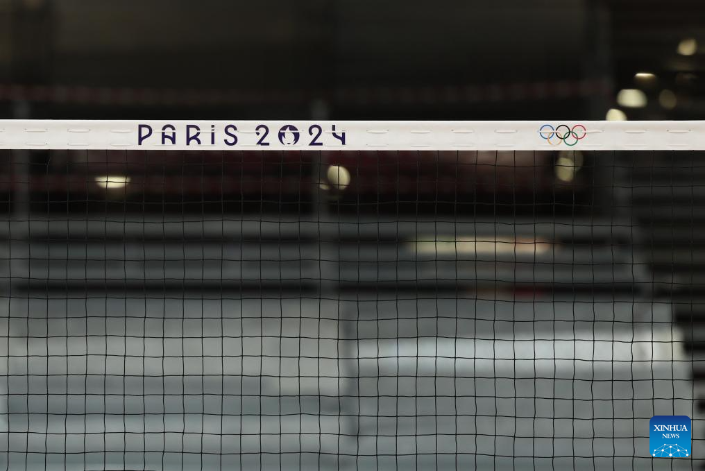 This photo taken on July 11, 2024 shows the volleyball facilities in the South Paris Arena, in Paris, France. The South Paris Arena will host sports events like weightlifting, handball, table tennis and volleyball during the Paris 2024 Olympic Games. (Photo by Julien Mattia/Xinhua)