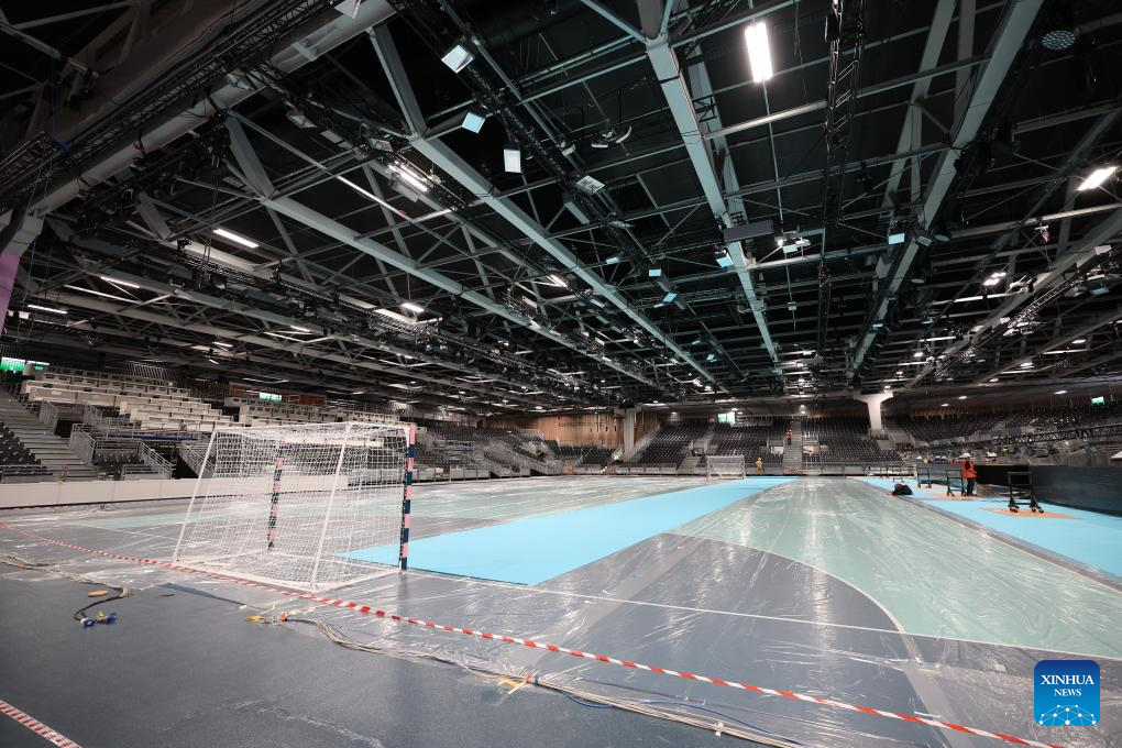This photo taken on July 11, 2024 shows the handball court in the South Paris Arena, in Paris, France. The South Paris Arena will host sports events like weightlifting, handball, table tennis and volleyball during the Paris 2024 Olympic Games. (Photo by Julien Mattia/Xinhua)