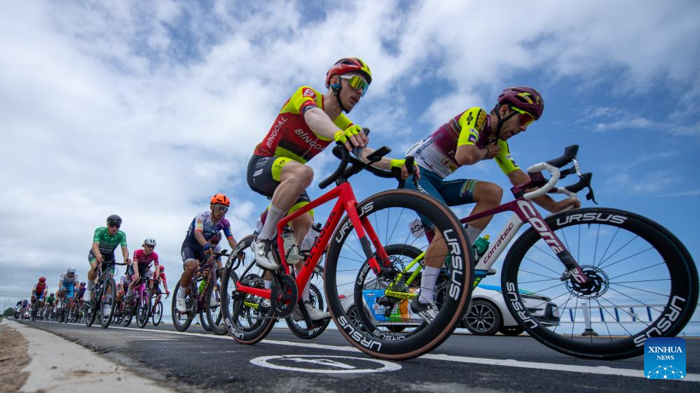 Cyclists compete during the stage 5 of the 23rd Tour of Qinghai Lake cycling race from Gonghe to Xihai, northwest China's Qinghai Province, July 11, 2024. (Photo by Pan Binbin/Xinhua)