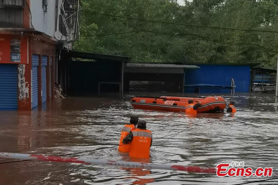 Downpours have hit Chongqing, raising waters above alert levels in 15 rivers. More than 130 local officers and soldiers were sent to help rescue trapped people in the affected areas.