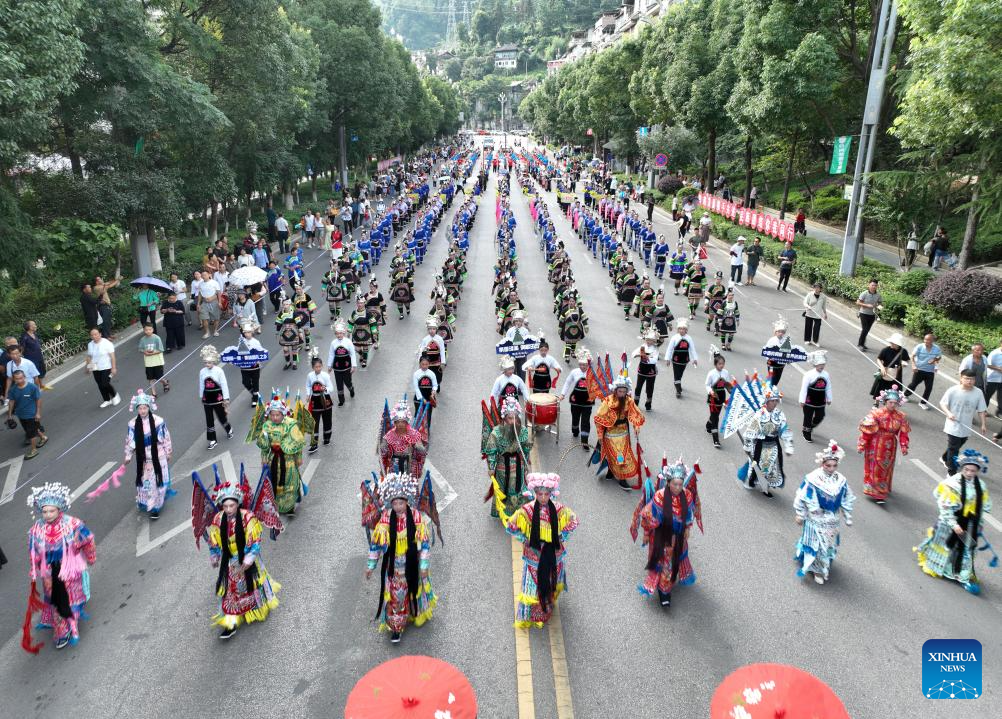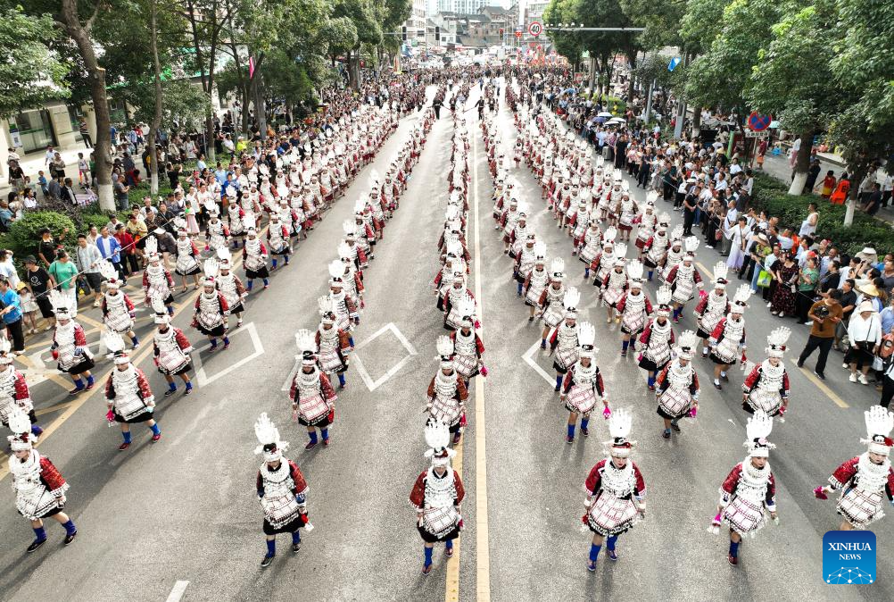 People take part in the celebration of "Liuyueliu", an ethnic festival, in Jianhe County of Qiandongnan Miao and Dong Autonomous Prefecture, southwest China's Guizhou Province, July 13, 2024. The annual celebration of the ethnic festival "Liuyueliu" lasts from July 11 to 14 here in Jianhe County. A series of cultural activities have been held during the celebration. (Xinhua/Yang Wenbin)