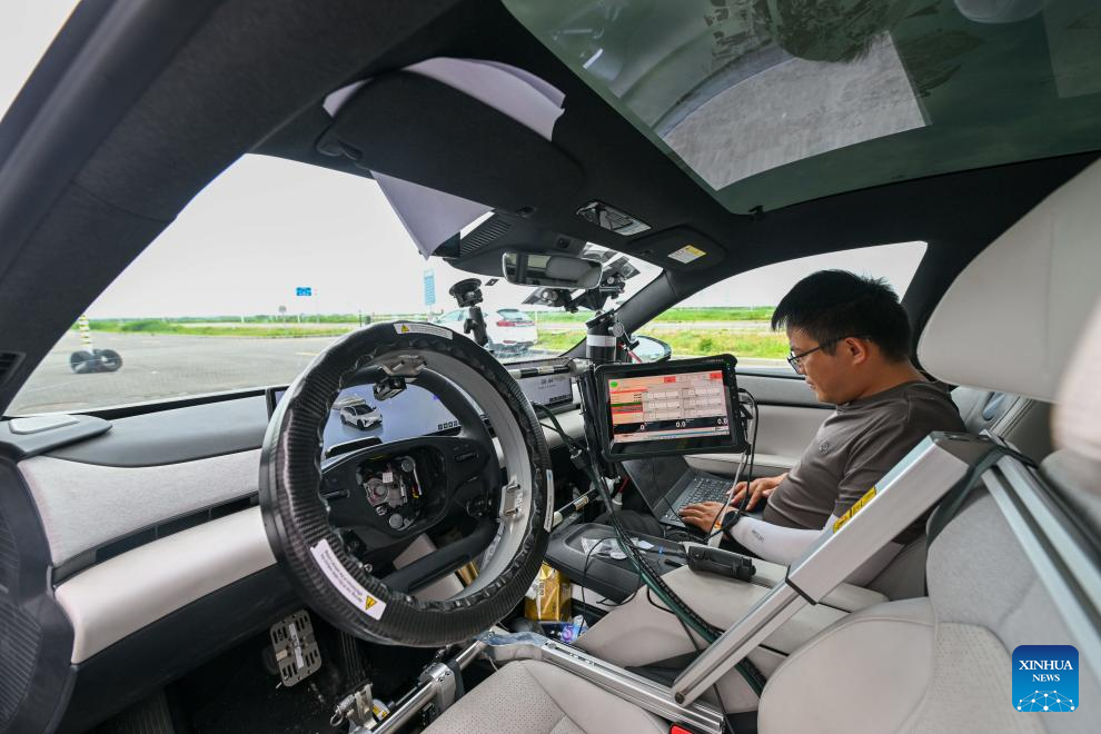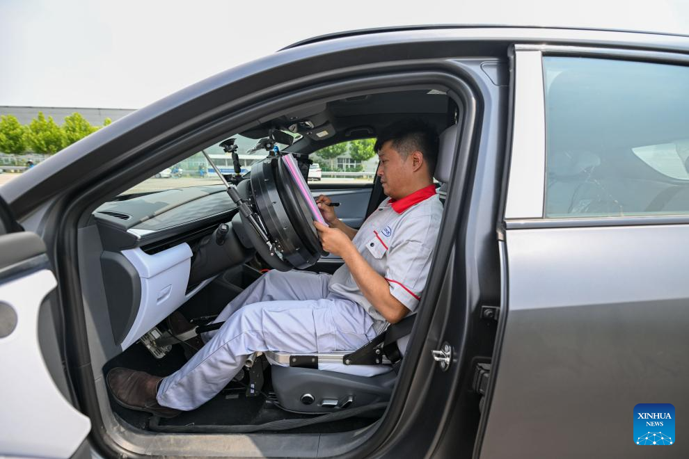 Intelligent connected vehicle tester Zhang Cheng conducts tests in an intelligent connected vehicle at an automobile inspection center in Tianjin, north China, June 19, 2024. Thanks to advances in electrification, networking, and intelligent transformation, along with progress in autonomous driving technologies, self-driving vehicles are gradually becoming a reality. As the industry develops, more professionals are becoming testers of self-driving vehicles. The profession "intelligent connected vehicle tester" was listed as one of 19 new professions by the Ministry of Human Resources and Social Security earlier this year. (Xinhua/Sun Fanyue)