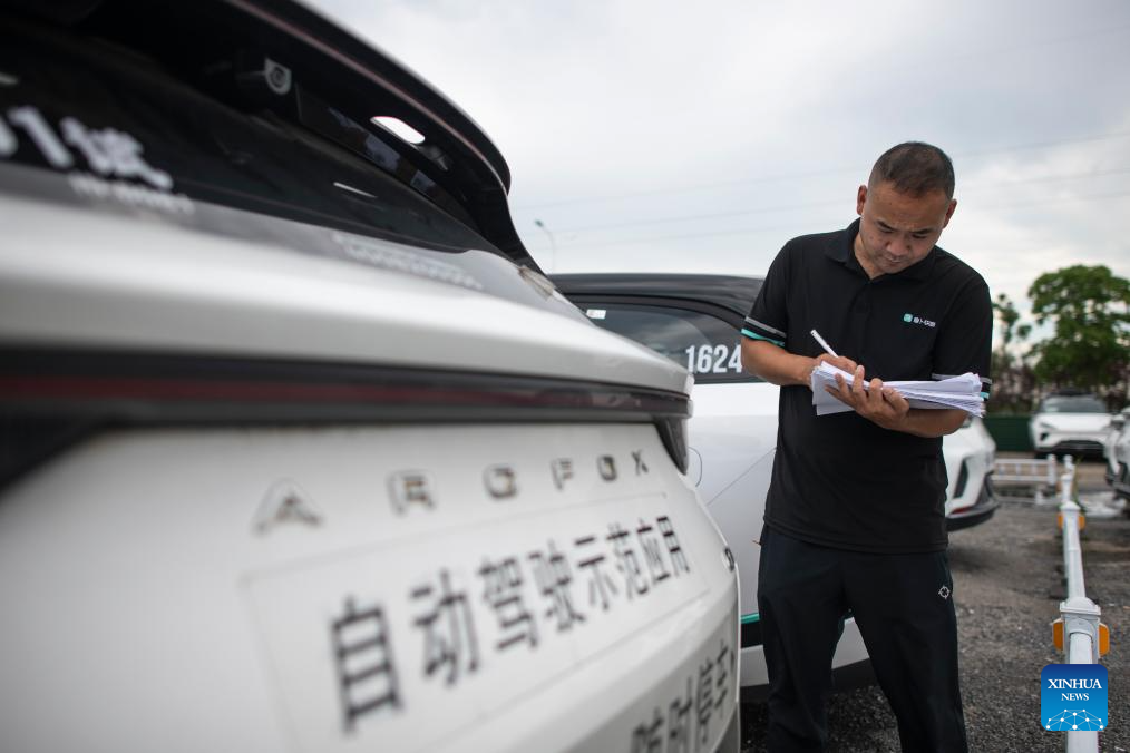 Intelligent connected vehicle tester Li Cheng checks a vehicle before a road test in Wuhan, central China's Hubei Province, July 4, 2024. Thanks to advances in electrification, networking, and intelligent transformation, along with progress in autonomous driving technologies, self-driving vehicles are gradually becoming a reality. As the industry develops, more professionals are becoming testers of self-driving vehicles. The profession "intelligent connected vehicle tester" was listed as one of 19 new professions by the Ministry of Human Resources and Social Security earlier this year. (Xinhua/Wu Zhizun)