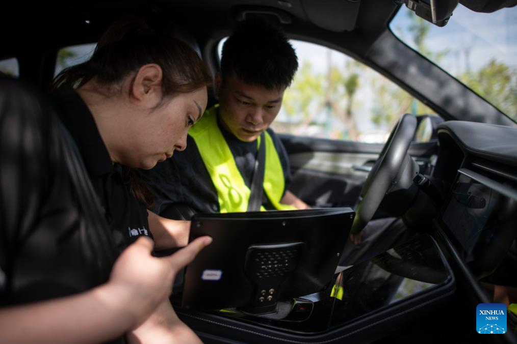 Intelligent connected vehicle tester Wang Juan (L) gives a road test training to a new employee in Wuhan, central China's Hubei Province, July 4, 2024. Thanks to advances in electrification, networking, and intelligent transformation, along with progress in autonomous driving technologies, self-driving vehicles are gradually becoming a reality. As the industry develops, more professionals are becoming testers of self-driving vehicles. The profession "intelligent connected vehicle tester" was listed as one of 19 new professions by the Ministry of Human Resources and Social Security earlier this year. (Xinhua/Wu Zhizun)
