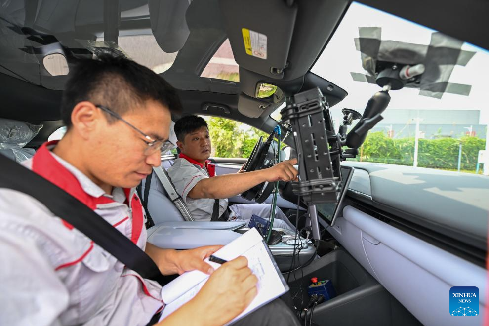 Intelligent connected vehicle tester Zhang Cheng (R) and his colleague Zhang Shuai conduct tests in an intelligent connected vehicle at an automobile inspection center in Tianjin, north China, June 19, 2024. Thanks to advances in electrification, networking, and intelligent transformation, along with progress in autonomous driving technologies, self-driving vehicles are gradually becoming a reality. As the industry develops, more professionals are becoming testers of self-driving vehicles. The profession "intelligent connected vehicle tester" was listed as one of 19 new professions by the Ministry of Human Resources and Social Security earlier this year. (Xinhua/Sun Fanyue)