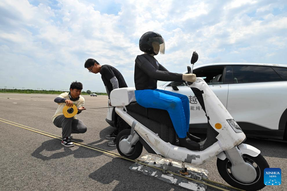 An intelligent connected vehicle conducts autonomous emergency braking test at an enclosed test field in Tianjin, north China, June 19, 2024. Thanks to advances in electrification, networking, and intelligent transformation, along with progress in autonomous driving technologies, self-driving vehicles are gradually becoming a reality. As the industry develops, more professionals are becoming testers of self-driving vehicles. The profession "intelligent connected vehicle tester" was listed as one of 19 new professions by the Ministry of Human Resources and Social Security earlier this year. (Xinhua/Sun Fanyue)