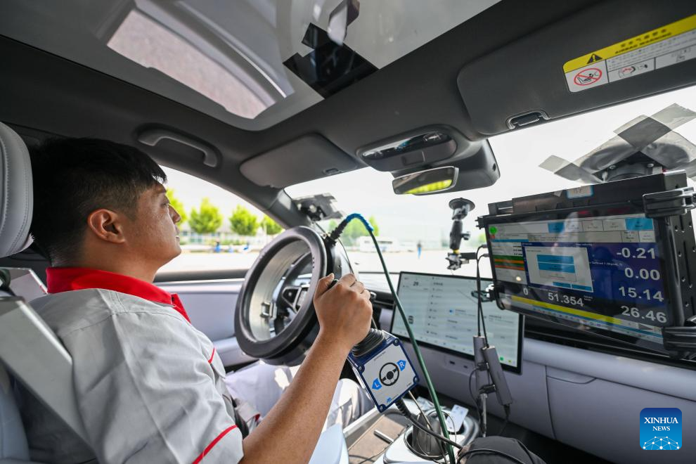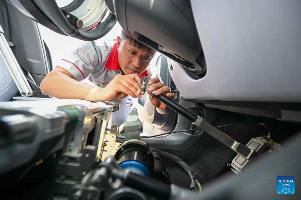 Intelligent connected vehicle tester Zhang Cheng installs a steering robot in an intelligent connected vehicle before a test at an automobile inspection center in Tianjin, north China, June 19, 2024. Thanks to advances in electrification, networking, and intelligent transformation, along with progress in autonomous driving technologies, self-driving vehicles are gradually becoming a reality. As the industry develops, more professionals are becoming testers of self-driving vehicles. The profession "intelligent connected vehicle tester" was listed as one of 19 new professions by the Ministry of Human Resources and Social Security earlier this year. (Xinhua/Sun Fanyue)