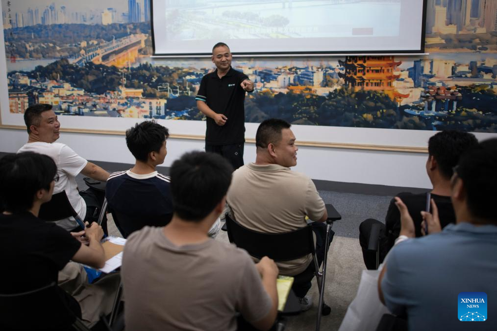 Intelligent connected vehicle tester Li Cheng (back row) gives a lesson to new employees in Wuhan, central China's Hubei Province, July 4, 2024. Thanks to advances in electrification, networking, and intelligent transformation, along with progress in autonomous driving technologies, self-driving vehicles are gradually becoming a reality. As the industry develops, more professionals are becoming testers of self-driving vehicles. The profession "intelligent connected vehicle tester" was listed as one of 19 new professions by the Ministry of Human Resources and Social Security earlier this year. (Xinhua/Wu Zhizun)