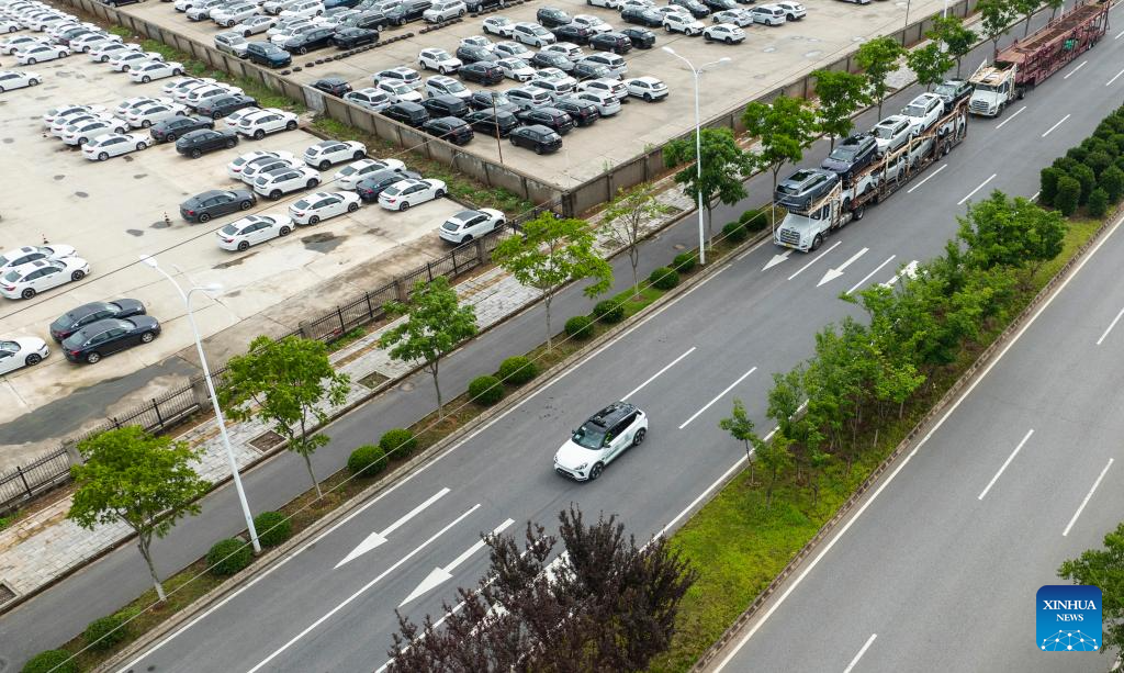 An aerial drone photo taken on July 4, 2024 shows an intelligent connected vehicle during a road test in Wuhan, central China's Hubei Province, July 4, 2024. Thanks to advances in electrification, networking, and intelligent transformation, along with progress in autonomous driving technologies, self-driving vehicles are gradually becoming a reality. As the industry develops, more professionals are becoming testers of self-driving vehicles. The profession "intelligent connected vehicle tester" was listed as one of 19 new professions by the Ministry of Human Resources and Social Security earlier this year. (Xinhua/Wu Zhizun)