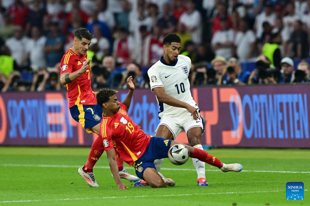 England's Jude Bellingham (R) vies with Spain's Lamine Yamal (C) during the UEFA Euro 2024 final match between England and Spain in Berlin, Germany, July 14, 2024. (Xinhua/Xiao Yijiu)