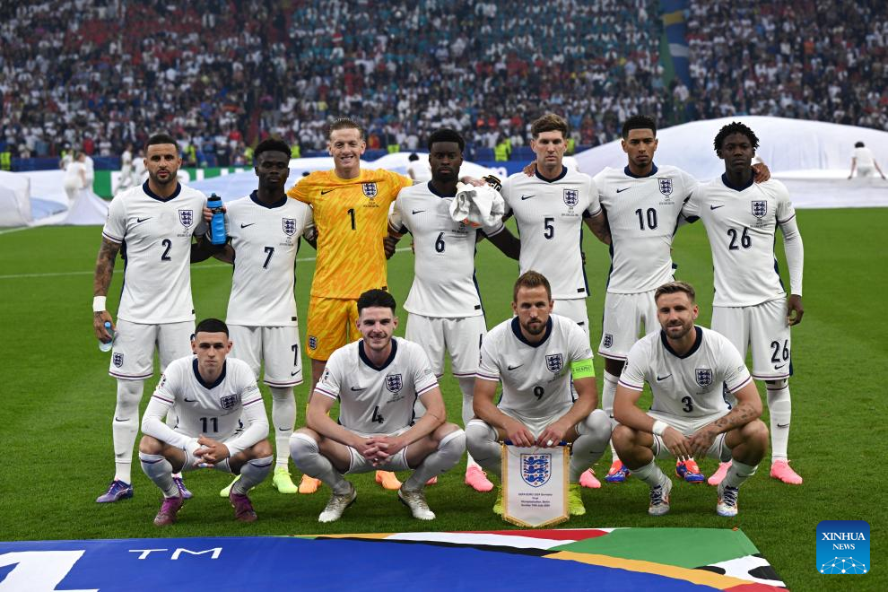 Starting players of England line up before the UEFA Euro 2024 final match between England and Spain in Berlin, Germany, July 14, 2024. (Xinhua/Xiao Yijiu)