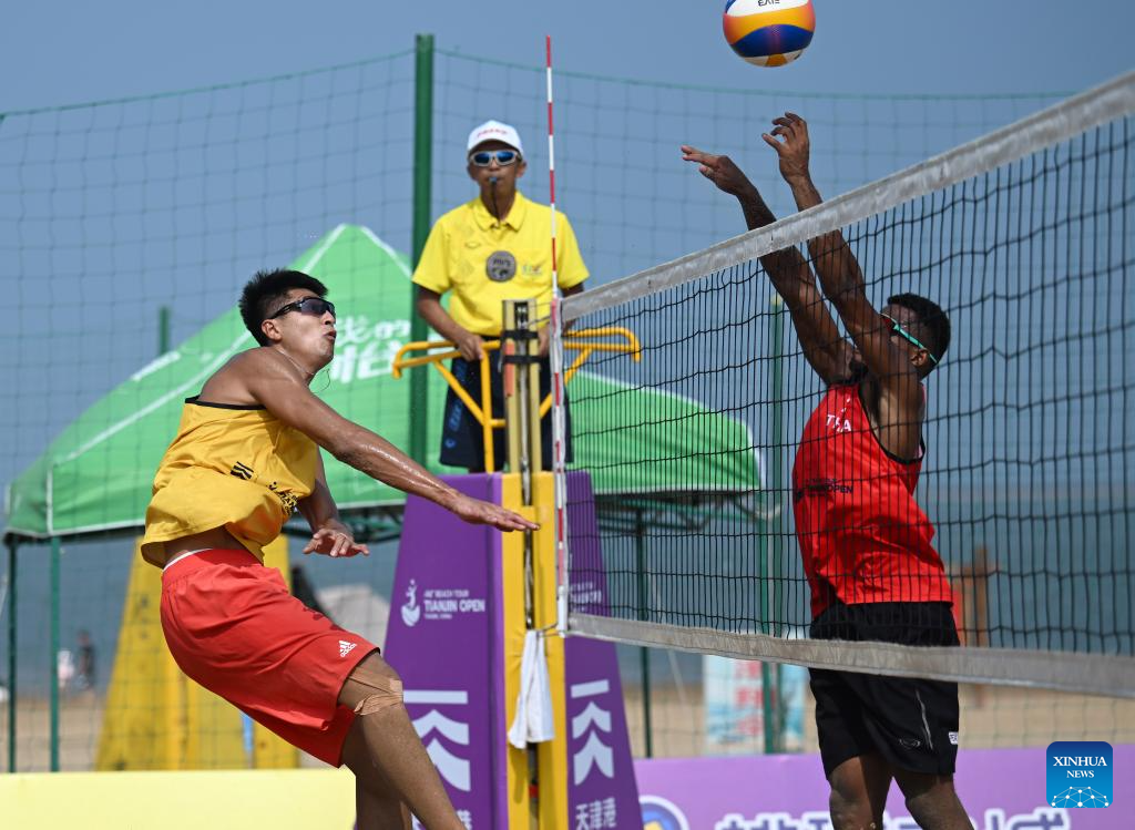 Wang Yanwei (L) competes during the men's bronze match between between Wang Yanwei/Liu Chuanyong of China and Netitorn Muneekul/Wachirawit Muadpha of Thailand at 2024 AVC Beach Tour Tianjin Open in Tianjin, China, on July 14, 2024. (Xinhua/Zhao Zishuo)