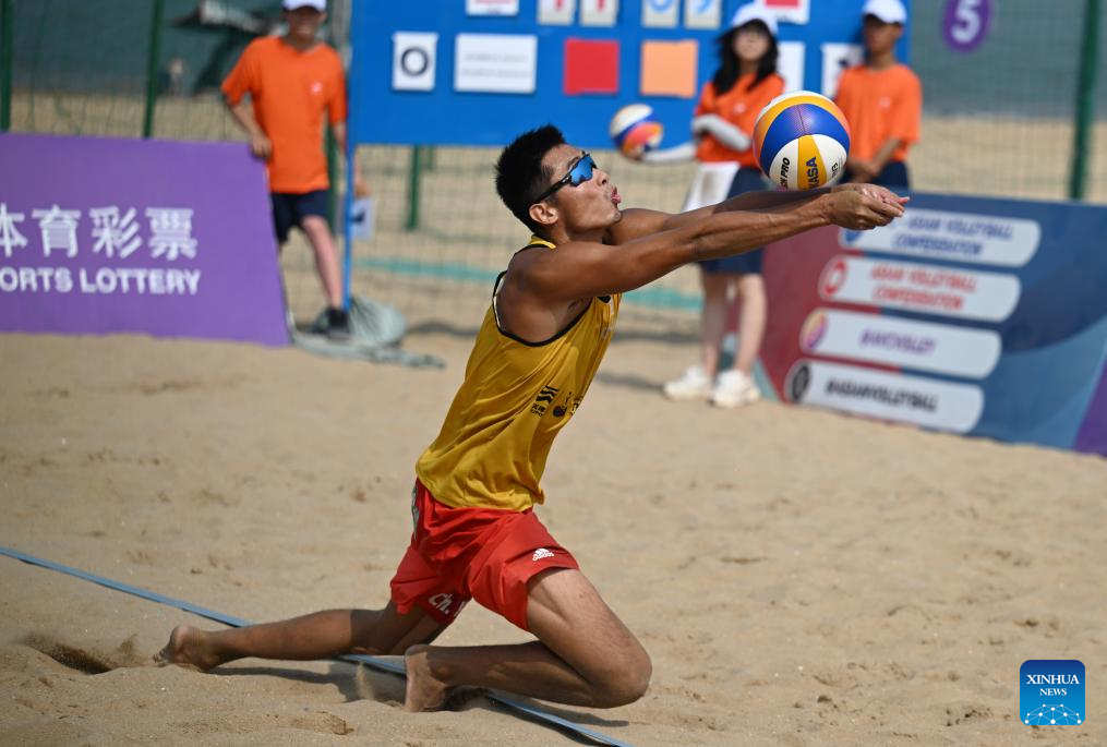 Liu Chuanyong competes during the men's bronze match between Wang Yanwei/Liu Chuanyong of China and Netitorn Muneekul/Wachirawit Muadpha of Thailand at 2024 AVC Beach Tour Tianjin Open in Tianjin, China, on July 14, 2024. (Xinhua/Zhao Zishuo)