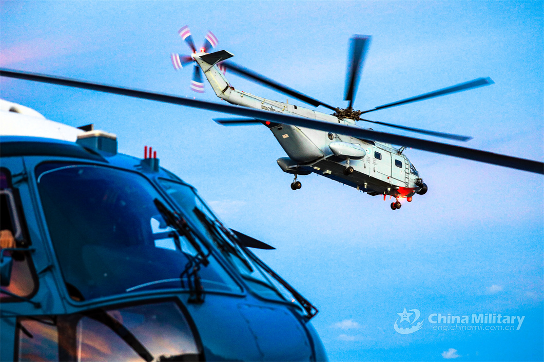 A ship-borne helicopter attached to a naval aviation unit lifts off and flies to a designated sea area during a maritime training exercise jointly conducted by the naval aviation unit and a flotilla under the PLA Navy on June 14, 2024. (eng.chinamil.com.cn/Photo by Zou Liyuan)