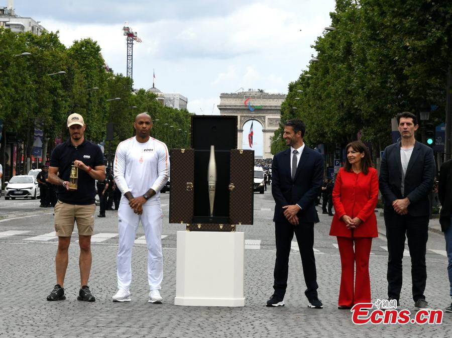 French football Olympics 2024 coach Thierry Henry (1st L) holds the Olympic torch during the Olympic Games Paris 2024 Torch Relay in Paris, France, July 14, 2024. (China News Service/Li Yang)