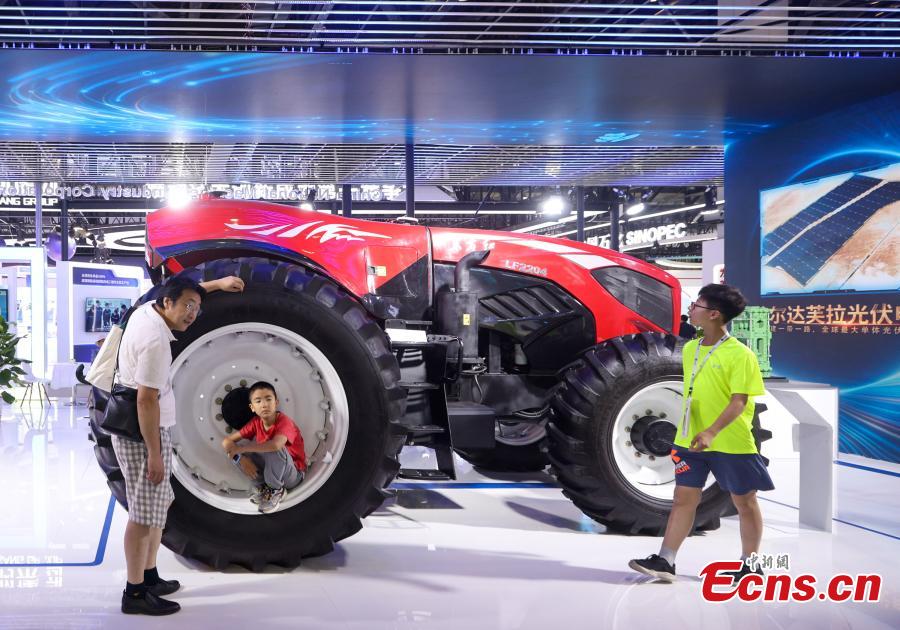 Visitors view an unmanned tractor displayed at the 26th China Beijing International High-tech Expo, July 14, 2024. (Photo: China News Service/Jia Tianyong)