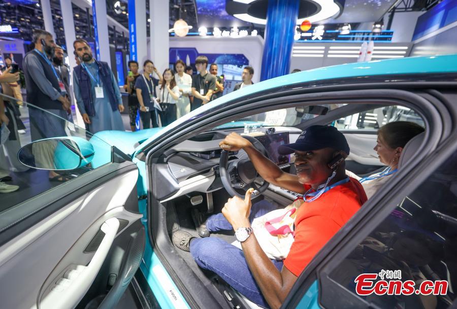 Foreign visitors experience a new energy vehicle displayed at the 26th China Beijing International High-tech Expo, July 14, 2024. (Photo: China News Service/Jia Tianyong)