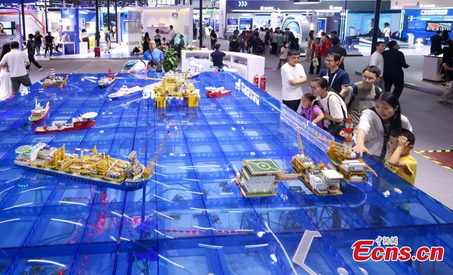 Visitors view a model showing the detection and exploitation of deepwater oil and gas from China National Offshore Oil Corporation (CNOOC) displayed at the 26th China Beijing International High-tech Expo, July 14, 2024. (Photo: China News Service/Jia Tianyong)