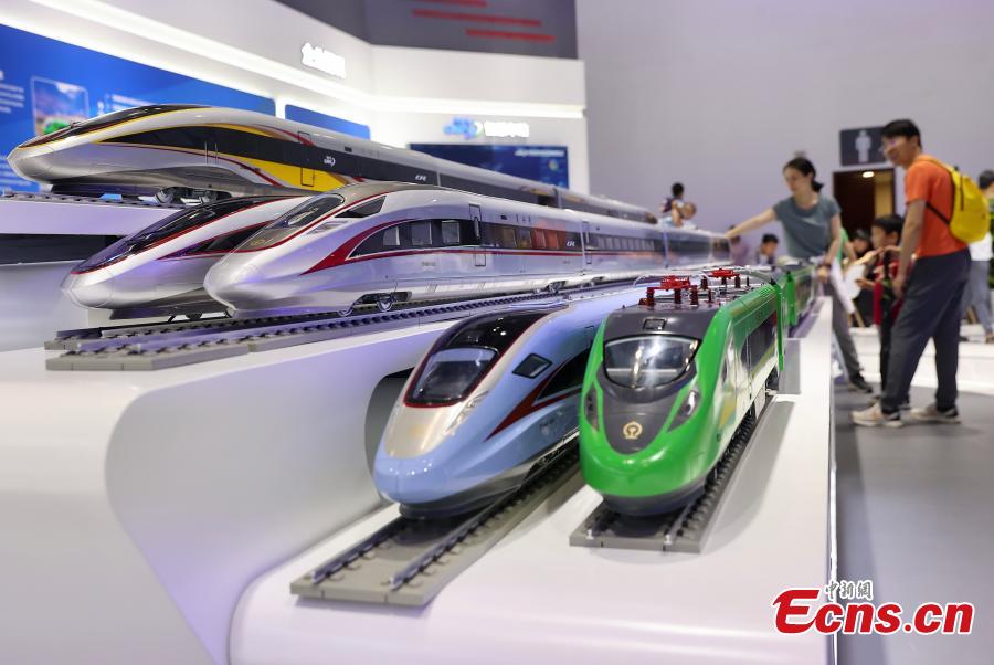 Models of electric multiple unit (EMU) trains are on display at the 26th China Beijing International High-tech Expo, July 13, 2024. (Photo: China News Service/Yi Haifei)