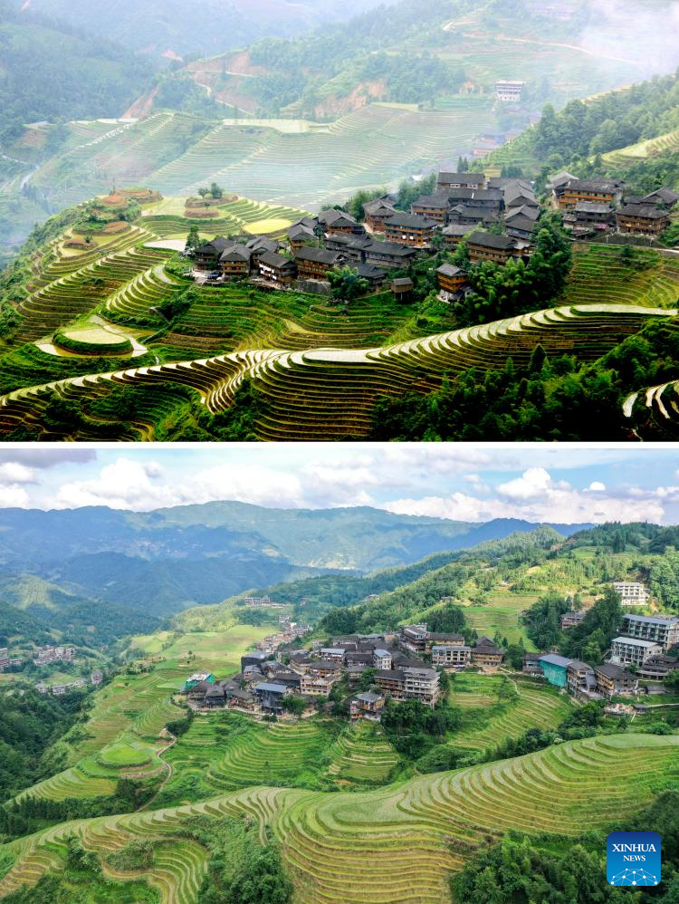 This combo photo shows homestays and terraced fields in 2013 (above, file photo) and 2024 (below, taken by Xinhua journalist Cao Yiming) at Dazhai Village of Longsheng County, south China's Guangxi Zhuang Autonomous Region. (Xinhua)