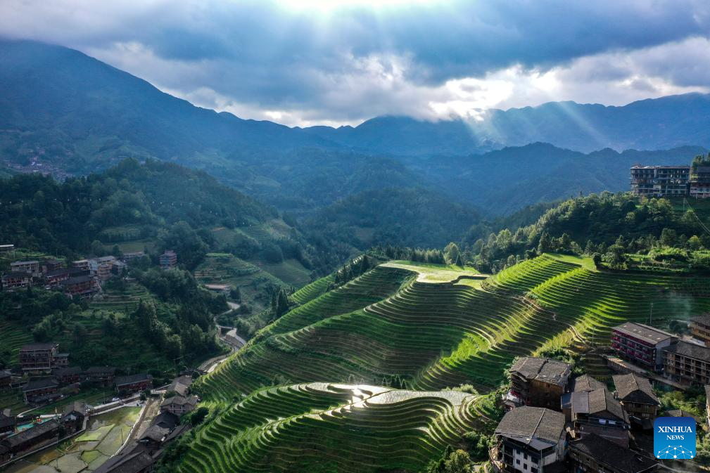 An aerial drone photo taken on July 11, 2024 shows terraced fields at Dazhai Village of Longsheng County, south China's Guangxi Zhuang Autonomous Region. (Xinhua/Cao Yiming)