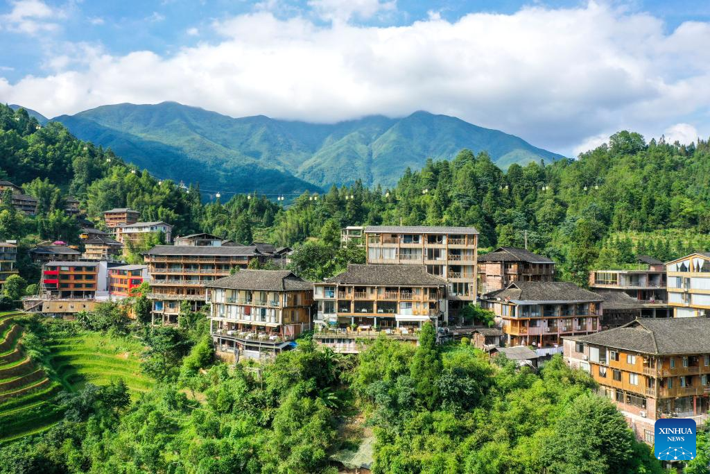 An aerial drone photo taken on July 10, 2024 shows homestays at Dazhai Village of Longsheng County, south China's Guangxi Zhuang Autonomous Region. (Xinhua/Cao Yiming)