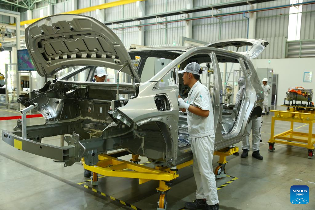 Staff members work at the electric vehicle (EV) factory of China's carmaker GAC Aion in Rayong province, Thailand on July 17, 2024. (Xinhua/Sun Weitong)