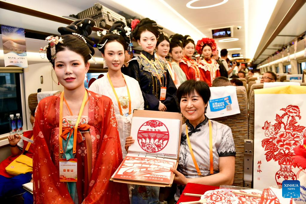 Yang Xiuling (R), an inheritor of intangible cultural heritage, shows her paper-cutting works on bullet train G4007 from Heze to Zhengzhou, July 18, 2024. The section from Zhuangzhai in east China's Shandong Province to Lankao in central China's Henan Province was put into service on Thursday, marking the full operation of the 472-kilometer-long Rizhao-Lankao high-speed railway.