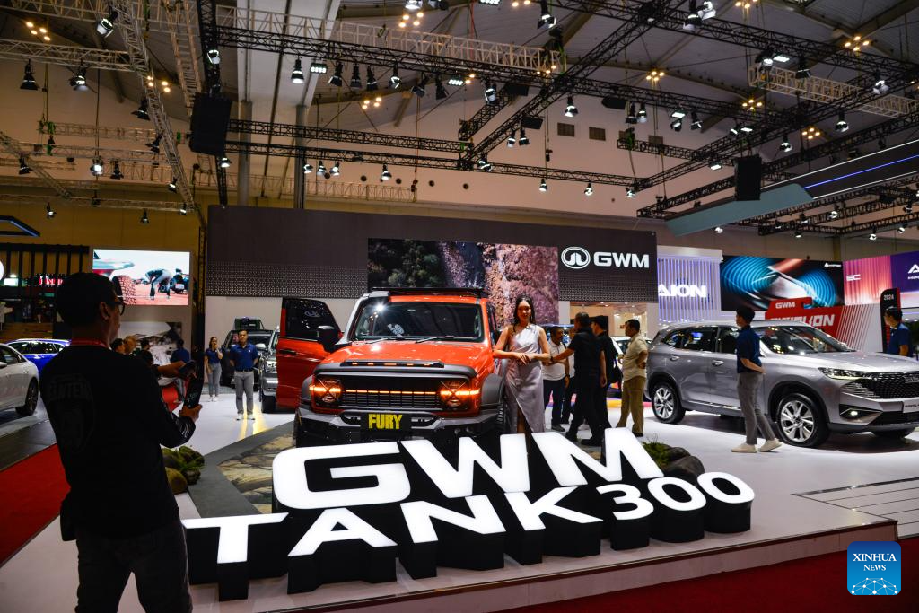 Visitors look at vehicles displayed at the booth of Chinese auto brand GWM at GAIKINDO Indonesia International Auto Show (GIIAS) 2024 in Tangerang, Banten Province, Indonesia, July 18, 2024. The 31st GIIAS opened at the Indonesia Convention Exhibition in Tangerang on Thursday. Dozens of international automobile brands appeared at the auto show which will last until July 28. (Xinhua/Xu Qin)