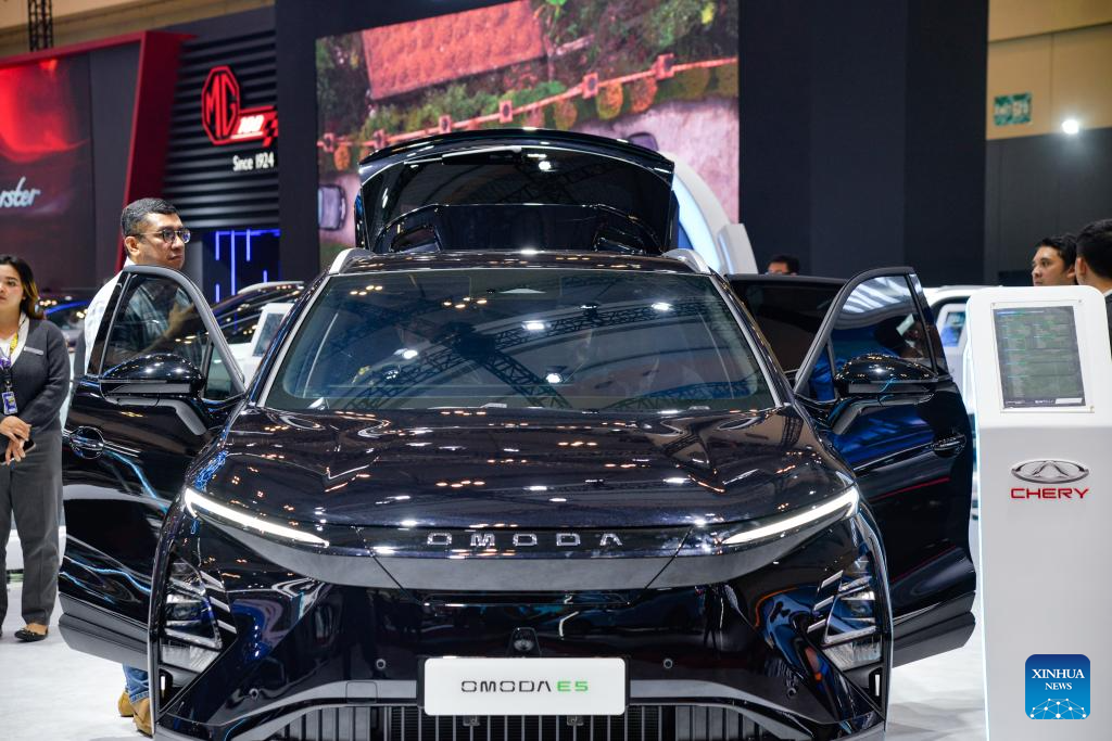 People visit the booth of Chinese auto brand CHERY at GAIKINDO Indonesia International Auto Show (GIIAS) 2024 in Tangerang, Banten Province, Indonesia, July 18, 2024. The 31st GIIAS opened at the Indonesia Convention Exhibition in Tangerang on Thursday. Dozens of international automobile brands appeared at the auto show which will last until July 28. (Xinhua/Xu Qin)