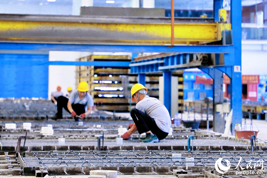 Workers fasten reinforcing steel bars before pouring concrete into the structure. (People's Daily Online/Li Weiyi)