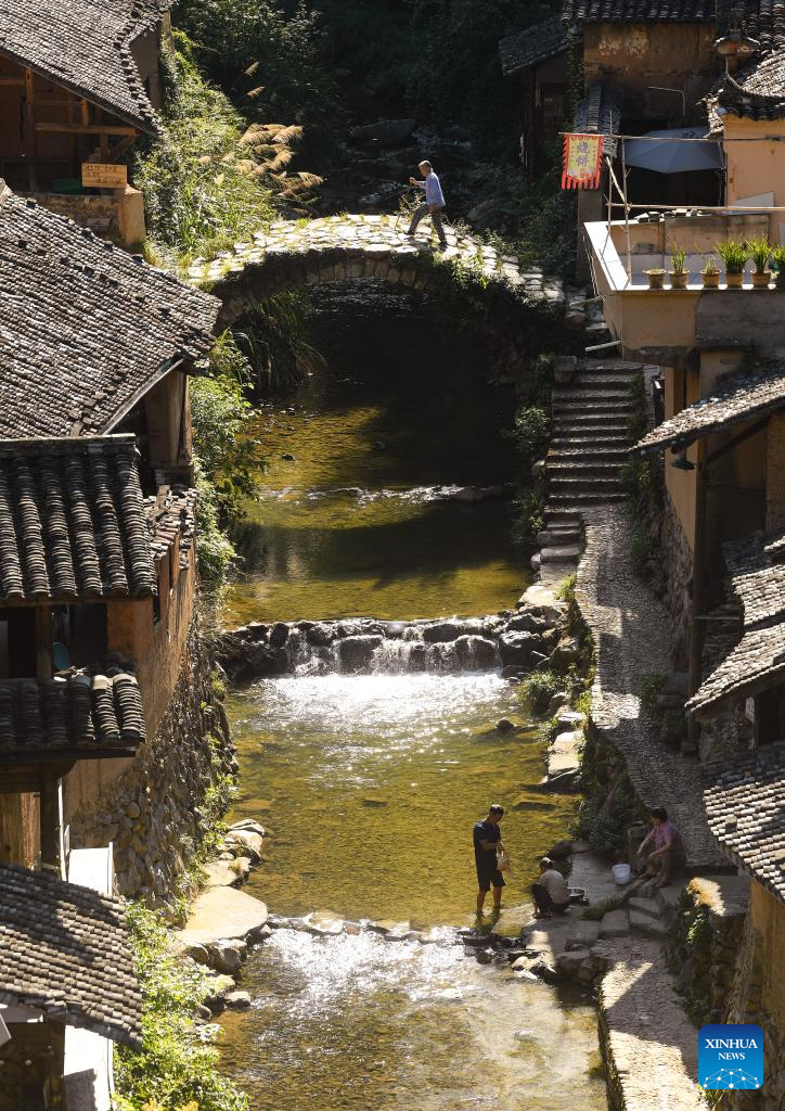 Tourists visit Songzhuang Village in Songyang County, east China's Zhejiang Province, July 17, 2024. Nestled in the mountains, Songzhuang Village of Songyang County boasts a history of over 600 years and preserves many traditional residences. In recent years, local government has renovated old houses and ancient paths and introduced new business forms to attract young talents to start their businesses there. (Xinhua/Weng Xinyang)