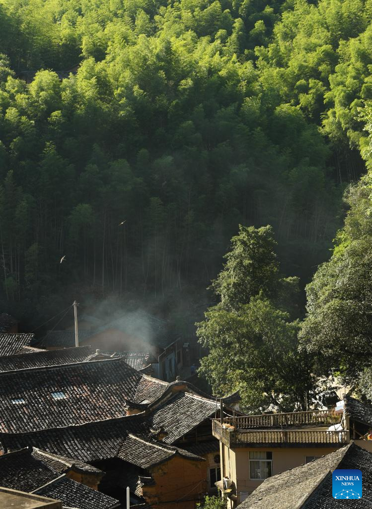 This photo taken on July 18, 2024 shows a view of Songzhuang Village in Songyang County, east China's Zhejiang Province. Nestled in the mountains, Songzhuang Village of Songyang County boasts a history of over 600 years and preserves many traditional residences. In recent years, local government has renovated old houses and ancient paths and introduced new business forms to attract young talents to start their businesses there. (Xinhua/Weng Xinyang)