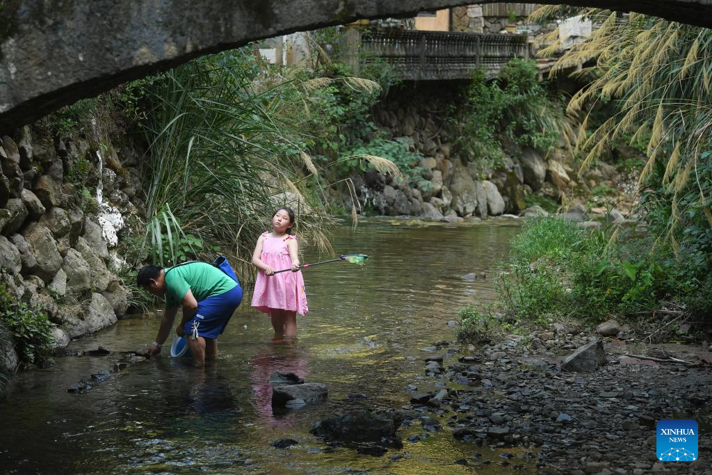 A girl catches fish with her father in a stream in Songzhuang Village of Songyang County, east China's Zhejiang Province, July 17, 2024. Nestled in the mountains, Songzhuang Village of Songyang County boasts a history of over 600 years and preserves many traditional residences. In recent years, local government has renovated old houses and ancient paths and introduced new business forms to attract young talents to start their businesses there. (Xinhua/Weng Xinyang)