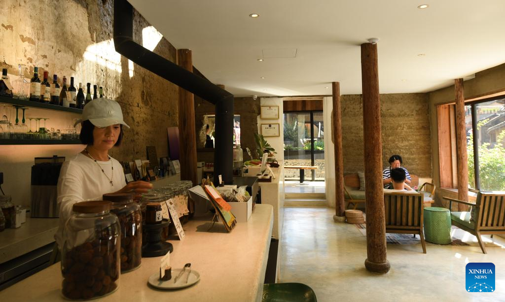 Sun Yingying from east China's Shanghai works at the reception of a homestay in Songzhuang Village of Songyang County, east China's Zhejiang Province, July 18, 2024. Nestled in the mountains, Songzhuang Village of Songyang County boasts a history of over 600 years and preserves many traditional residences. In recent years, local government has renovated old houses and ancient paths and introduced new business forms to attract young talents to start their businesses there. (Xinhua/Weng Xinyang)