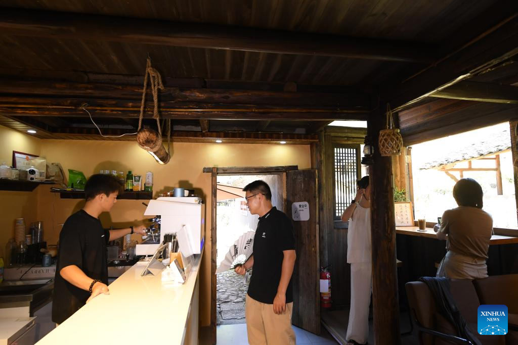 Zhu Binjie (1st L), a young entrepreneur from Shaoxing City, makes coffee for customers in Songzhuang Village of Songyang County, east China's Zhejiang Province, July 18, 2024. Nestled in the mountains, Songzhuang Village of Songyang County boasts a history of over 600 years and preserves many traditional residences. In recent years, local government has renovated old houses and ancient paths and introduced new business forms to attract young talents to start their businesses there. (Xinhua/Weng Xinyang)