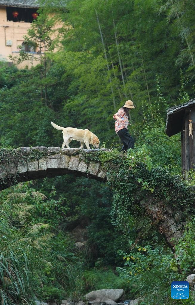 A tourist walks on a bridge in Songzhuang Village of Songyang County, east China's Zhejiang Province, July 17, 2024. Nestled in the mountains, Songzhuang Village of Songyang County boasts a history of over 600 years and preserves many traditional residences. In recent years, local government has renovated old houses and ancient paths and introduced new business forms to attract young talents to start their businesses there. (Xinhua/Weng Xinyang)