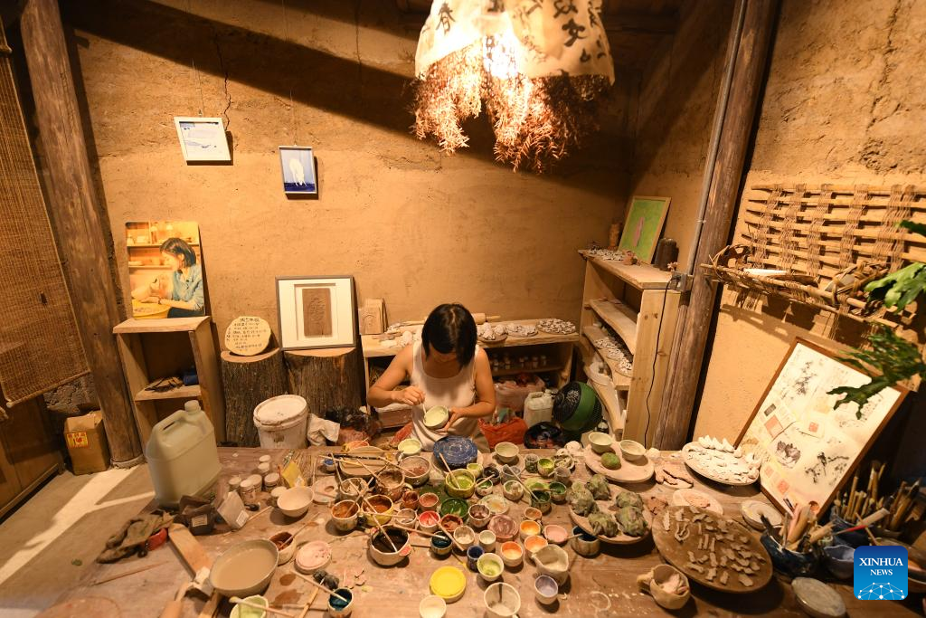 He Susu, a craftswoman from central China's Henan Province, makes a pottery ware at her studio in Songzhuang Village of Songyang County, east China's Zhejiang Province, July 17, 2024. Nestled in the mountains, Songzhuang Village of Songyang County boasts a history of over 600 years and preserves many traditional residences. In recent years, local government has renovated old houses and ancient paths and introduced new business forms to attract young talents to start their businesses there. (Xinhua/Weng Xinyang)