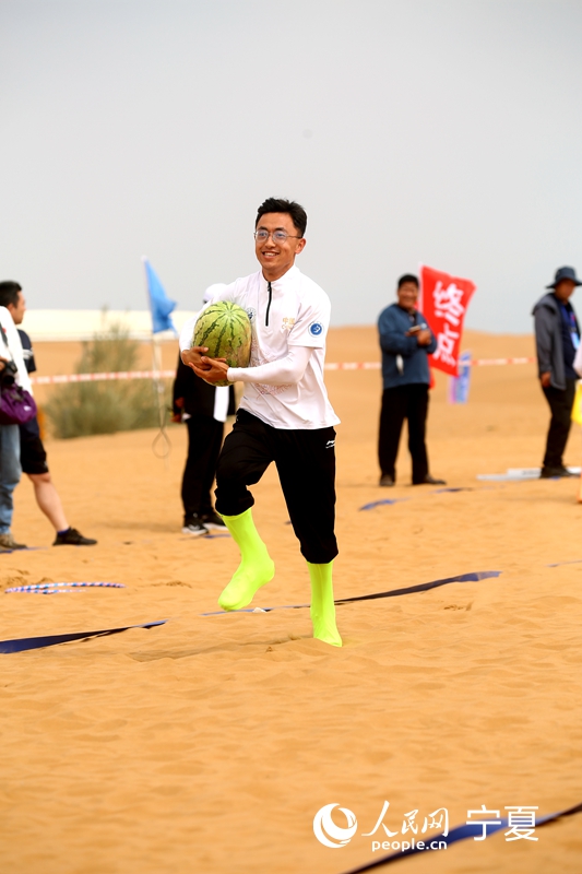 A contestant competes in a watermelon harvest event during the desert sports contest at Shapotou scenic spot in Zhongwei city, northwest China's Ningxia Hui Autonomous Region. (People's Daily Online/Yan Mengjie)