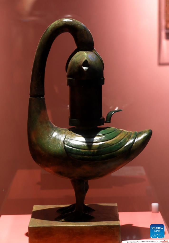 This photo taken on July 18, 2024 shows a chocolate replica of a bronze lamp at a chocolate museum in the Great Tang All Day Mall in Xi'an, northwest China's Shaanxi Province. The chocolate museum, covering an area of 10,000 square meters, showcases more than 100 chocolate creations themed on Chinese ancient architecture and cultural relics which attract lots of visitors. (Xinhua/Liang Aiping)