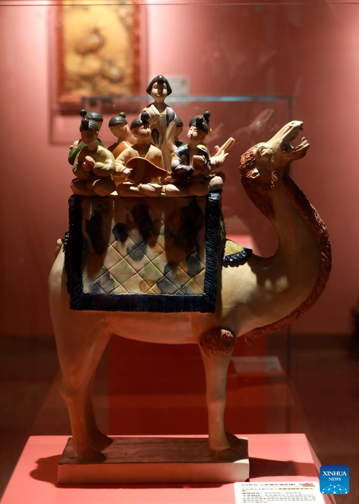 This photo taken on July 18, 2024 shows a chocolate replica of a tri-colored glazed pottery at a chocolate museum in the Great Tang All Day Mall in Xi'an, northwest China's Shaanxi Province. The chocolate museum, covering an area of 10,000 square meters, showcases more than 100 chocolate creations themed on Chinese ancient architecture and cultural relics which attract lots of visitors. (Xinhua/Liang Aiping)